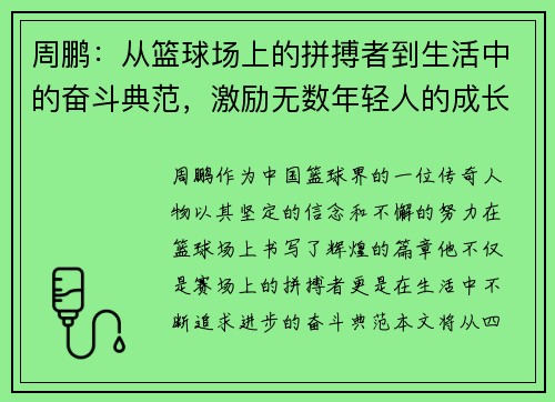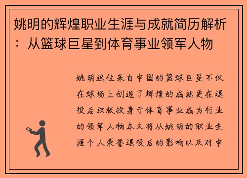 姚明,这位中国篮球的传奇人物,不仅在NBA取得了辉煌的成就,更深刻地影响了整个中国篮球的发展。他以其出色的技术、卓越的表现和高大的身材,成为了全世界瞩目的焦点。本文将从姚明的篮球技术、在NBA的表现、中国篮球的发展以及他对年轻球员的影响四个方面进行详细探讨,深入分析姚明如何通过自己的努力与才华,推动了中国篮球走向更广阔的舞台,同时也为后来的年轻运动员树立了榜样。通过对这些因素的综合评估,我们可以更...