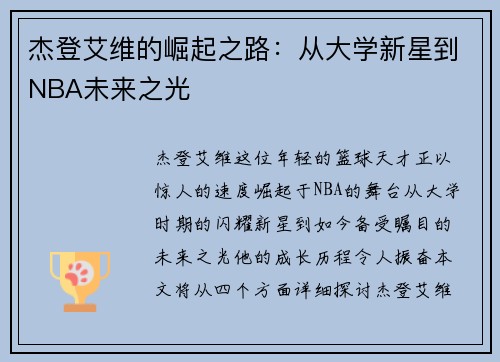 加维,这位年轻而才华横溢的足球运动员,从青训小将一路走来,逐渐成长为世界级球星。他的足球之路充满了艰辛与努力,也伴随着无数荣耀与成就。本文将从四个方面详细阐述加维的成长故事:他的早期训练经历、在俱乐部的发展历程、国家队的表现,以及他对未来的展望。在每一个环节中,加维展现出的拼搏精神和卓越才能,让人们更加期待这位小将未来的发展。通过这些方面,我们不仅能更好地理解加维,也能感受到当代足球运动员所面临的...